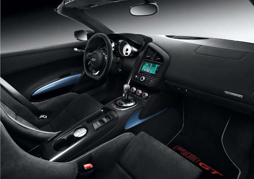 當然減重的工程並非僅集中在車身鈑件而已,針對引擎組件、變速箱、輪圈與煞車等部份也進行了程度不一的輕量化工程,以追求更輕盈的重量。然而在座艙內進行的減重卻帶來了最佳的成效,R8 GT Spyder車上的兩張座椅採用強化玻璃纖維製作椅背與基座,與兩張多功能電動椅相比,整整減去31.5公斤。R8 GT Spyder當然繼續使用電動帆布軟頂,車頂的開闔時間則需要19秒,而且在時速50km/h以下時都能操作。