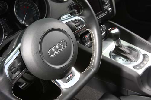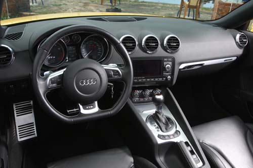 為了裝上電動敞篷,TT-S Roadster做出了某種程度的犧牲,原本聊備一格的後座,在TT-S Roadster車上成為收納電動敞篷的空間,而在座椅頭枕後方,則追加了兩具大型的防滾桿,作為車輛萬一翻覆時的防護措施。原本後座空間的部份除了裝上電動敞篷之外,在兩張座椅之間的後方,則裝上硬頂車款不需要的電動迴風網,透過中控檯上的按鈕可電動升降,在將迴風網升起時,可有效降低高速行駛時捲入車艙內的亂流,提高開篷行駛時的舒適性。儀錶板與中控檯的陳設多數維持TT的基本設計,為了提醒駕駛人此車的性能不凡,儀錶板內刻意加上了TT-S的字樣,平底式方向盤當然是TT-S車上的標準配備,過去如此設計的方向盤多數僅出現在賽車與超級跑車之上,現在也漸漸在小跑車與市售車上流行了起來。與標準TT相比,這部、TT-S車艙內出現了兩項十分搶眼的配備,分別是特製的可調式筒型賽車椅與RNS-E衛星導航主機,雖然RNS-E主機的導航功能在台灣暫時仍無用武之地,不過根據Audi方面所提供的資訊,不久之後的新車將會出現繁體中文的多功能介面。