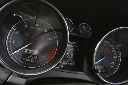| 為了提醒駕駛人此車的性能不凡,轉速錶的底部特別加上了TT-S的徽飾。 |