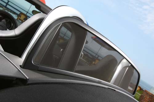 | 座艙後方的迴風網採電動升降,有助於預防高速行駛時氣流回捲至座艙內部,是敞篷車的舒適性配備之一。 |