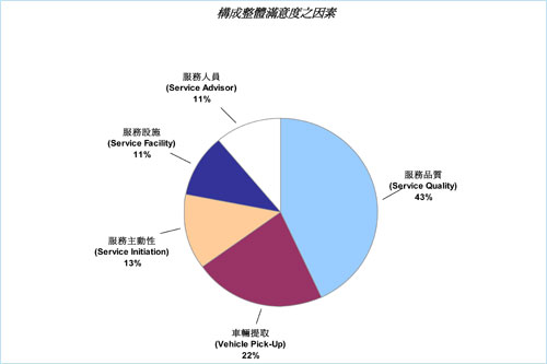 今年已邁入第14年的台灣顧客滿意度調查,主要是評量車主在購車後的12至24個月期間回授權經銷商服務中心進行車輛保養或維修服務的整體滿意度。這項調查根據五項因素對整體滿意度進行評分,依其重要性排序為:服務品質、車輛提取、服務主動性、服務設施,以及服務人員。調查的滿意度以1000分為滿分。2011年調查,顧客對經銷商的售後服務整體滿意度為857分。