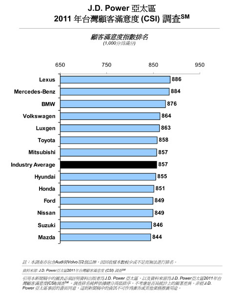 2011年台灣顧客滿意度(CSI)調查是以2,795名於2009年3月至2010年6月期間購買新車,並於2010年9月至2011年6月期間在授權服務中心進行車輛保養維修服務之新車車主的回饋意見為依據。調查工作於2011年3月至6月間進行。