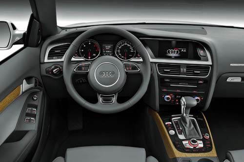 在動力系統方面,小改款過後的A5車系共有七種不同的動力來源,包括三種汽油以及四種柴油引擎,這些引擎全數具備缸內直噴渦輪增壓系統,而且不僅如此,所有的車型都將引擎主動啟閉系統以及煞車動能回收系統列為標準配備,在新動力的協助下,A5車系的二氧化碳排放量降低達22%。全新的入門引擎是輸出170hp的1.8 TFSI引擎,經過大幅修改之後,在A5 Coupe車上可達到17.5km/L的平均油耗,比先前車款進步22%。主力引擎則是2.0 TFSI,此一動力系統則未經修改;新加入A5陣線的則是3.0 TFSI機械增壓引擎,動力輸出則為272hp。在變速箱配置方面,則是比照過去的組合,前驅車款配上Multitronic八速手自排,四輪驅動系統則使用七速S-Tronic,另外買家還可以選用傳統手排變速箱。為了配合新的節能裝置,Audi Drive Select系統的配置也經過調整,四種模式分別為Efficiency、Auto、Comfort與Dynamic,與我們前往海外試駕的全新Q3相同,Audi Drive Select裝上了獨立的按鈕,方便駕駛人快速切換動力模式。