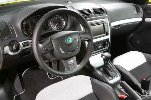 | 雙色內裝、附RS銘牌與換檔撥片的三幅式方向盤,Octavia Combi RS車系的內裝相當動感。 |