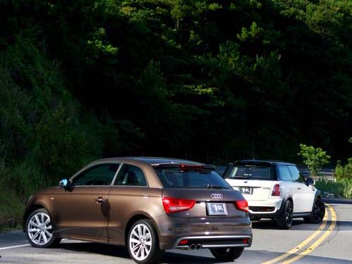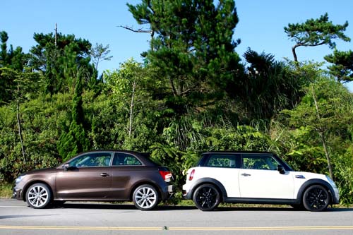 流暢的律動感與節奏讓這部A1 Sport展現出極高的駕駛樂趣;Mini Cooper S重心轉變、路感回饋與方向盤的控制均非常直接、密切。A1 Sport與Mini Cooper S相較下的表現如何?現今絕大多數的歐系進口車都配有先進的動態穩定控制系統,但A1 Sport在激烈的彎道操駕過程中並不會感受到太多電子儀器的牽絆,讓人盡情的踩著油門享受速度與征服彎道的快感。在面對連續爬坡的多彎山路中,這具1.4引擎的扭力輸出超乎意料之外,氣力飽滿且隨傳隨到,七個檔位的S-Tronic變速箱,能適時供應最合乎需求的檔位,且最讓人印象深刻的就是手排模式的控制,只要退檔後的引擎轉速在合理範圍內(不超過紅線區),方向盤左邊的退檔撥片都能夠立即作動而提供檔煞功能,不管是踩煞車退檔入彎、出彎急加速或過彎,各項動作都顯得極為順暢。懸吊系統在面對連續彎路也有著極高的協調性,一開始雖然會有偏軟的感覺,但隨著彎角與路面的起伏變化,柔中帶剛的特性恰好符合了國內道路型態的需求,流暢的律動感與節奏讓這部A1 Sport展現出極高的駕駛樂趣。當然,我們也趁機在老地方進行上坡的計時攻略測試,A1 Sport作出的成績為1分52.1秒,以0.15秒微幅差距險勝Mini Cooper S的1分52.25秒。以Go-Kart概念為訴求的Mini Cooper S,在懸吊設定上向來是偏硬的,行經修補路面或坑洞時會出現較明顯的震動感,但一進入彎道後就完全變了個樣兒。原本偏硬的懸吊轉為靈活且精準的轉向操控,支撐性極佳的避震器可充分吸收離心力對車身所造成的影響,重心轉變、路感回饋與方向盤的控制均非常直接、密切,短軸距與短車身的特點也在此刻顯露無疑,六速手自排與184匹馬力之間也有著極佳默契,讓Mini Cooper S無時無刻均顯得精力充沛,205/45/17的輪胎,即便加速出彎時較容易出現空轉的摩擦聲,但抓地力與循跡性仍在水準之上,展現標準的Go-Kart性格。與A1 Sport相較下,Mini Cooper S的強硬作風很容易被突顯出來,感覺雖然沒有像A1 Sport那般舒適,但是對部分熱愛速度的消費者來說,愈強硬反而愈能鞏固駕馭的信心,敏銳且犀利的速度特性也成為Mini Cooper S的優勢所在。