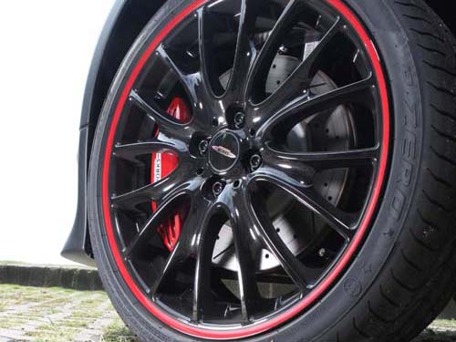 | 輪圈換上JCW專屬的18吋規格及黑紅配色塗裝,煞車系統也同樣升級為對向四活塞及316mm碟盤。 |