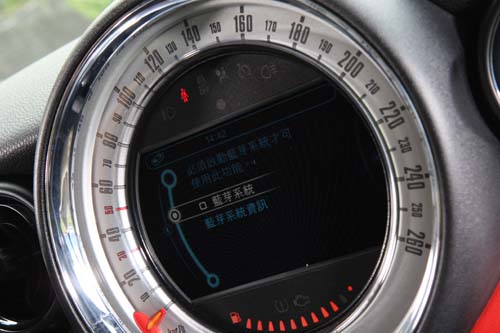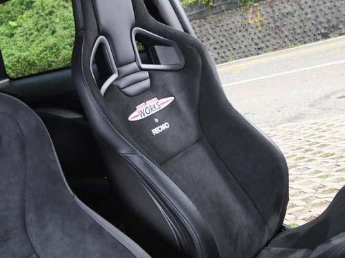獨特的火紅色車身及黑車頂配色,這部Mini Cooper S JCW在陽光下顯得特別耀眼,也將JCW配件的獨特性發揮到淋漓盡致,引擎蓋上的兩道黑色條紋對於速度雖無任何貢獻,但卻讓專屬的黑色頭燈底與水箱護罩在視覺上顯得更為協調,而往前延伸的下導流翼,雖隱身在黑色塑膠之中,但卻能夠提昇高速行駛的車頭下壓力,加上18吋黑紅配的JCW輪圈與碳纖維後尾翼,高反差配色讓它散發濃郁性能味。打開車門,一對繡有JCW廠徽的賽車座椅立即吸引我們的關愛眼神,由座椅名廠Recaro所代工的兩張椅子,雖仍為手動調整設計,但採用觸感細膩且附著力極大的麂皮材質所包覆,且為符合原廠在安全方面的要求,椅背外側還附設了側邊安全氣囊,即便這兩張座椅的售價高達28萬元,但優異的質感與安全性仍是一項非常划算的投資。此外,引擎轉速錶兩側也多出兩顆分別顯示側向G值(右)與扭力輸出值(左)的顯示錶,強化機能性與視覺上的戰鬥氣息,讓人一上車便躍躍欲試想體驗2011年式Mini Cooper S JCW的過人之處。
