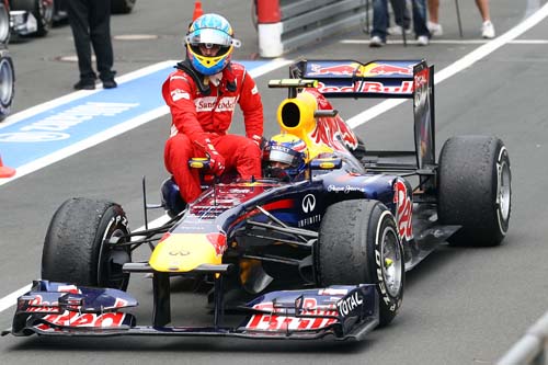 | F.Alonso德國站賽後油量不足,搭M.Webber的便車回來。 |