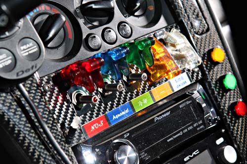 | 內裝部分最吸睛因該就是要價不斐的Defi Super Sports Cluster-02「簡稱DSSC」,雖然定價高達23萬日幣不過還不是有錢買得到的逸品。另外為了滿足車主換想當個戰鬥機飛行員的夢想,駕士也特別在中控安裝上NOS及水噴射等安全開關,營造出不同於一般Legacy的氣息,而為了提供高速衝刺時的信賴感,六點式防滾架及Bride怪獸椅都是日本購入的正品,畢竟高速是不容許絲毫閃失。 |