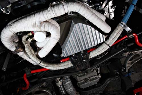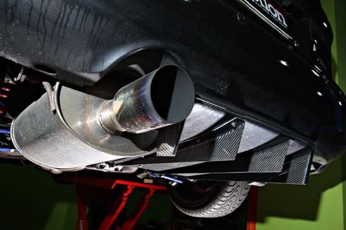 | 車尾的碳纖維後下擾流也是駕士專為這輛BE所打造,與一般時下流用STI部品不同,更常的導風翼能徹底將空氣安定在固定位置後排出,大幅減少左右空氣的干涉。排氣系統部分雖然尾段是採用藤壺的街道式樣排氣管,不過為了對應2.6升的排氣量及T04Z渦輪機所帶來的大量廢氣,全段管路也幾乎都已更改為100mm的口徑。 |