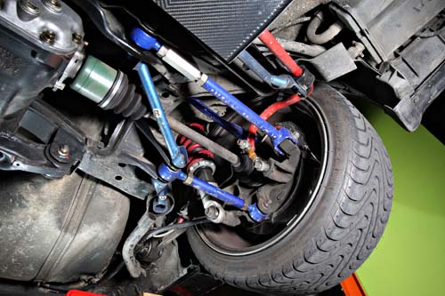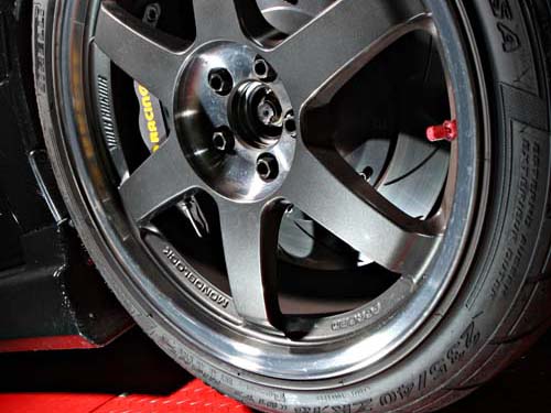 | 對於這種高速衝刺設定的車輛來說,懸吊的設定就非常重要,輪胎要如何保持全時抓地力及接觸面積的計算,都會左右高速行駛下的安全,因此這輛BE底盤部分也全數換上Hardrace及CUSCO可調整連桿,來設定高速所需的傾角及TOE。目前足下的Quantum避震器,雖然彈簧磅數僅採F12kg/mm、R10kg/mm,不過較短的行程會造成高速衝刺的不安定感,因此車主也決定換上行程較長的避震器好讓輪胎可確實服貼在地面。最後輪胎則是為了短距離衝刺選擇上tw60的倍耐力CORSA,最後制動系統當然就是採外油道。 |