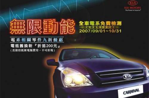 Kia總代理太古運通汽車自9月1日起~10月31日止,舉辦為期兩個月的「無限動能」全車電系免費檢測服務活動。透過服務廠全面引進電導電力測試儀器,可精確檢測車輛充電系統的健康情形,避免愛車發生無電啟動的窘況。