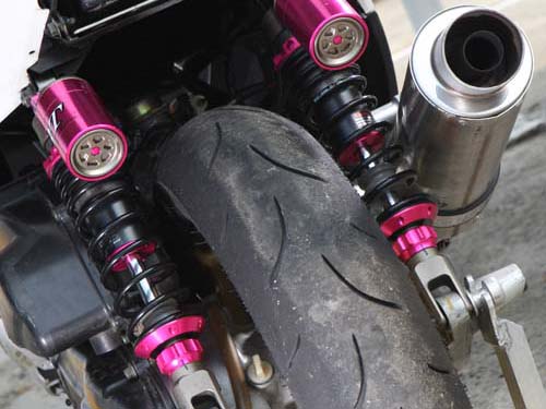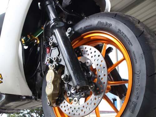 | BP的外掛氮氣瓶避震器搭配DUNLER的有紋熱熔胎,讓這部勁戰廠車在彎道中可以維持最佳的穩定性。 |