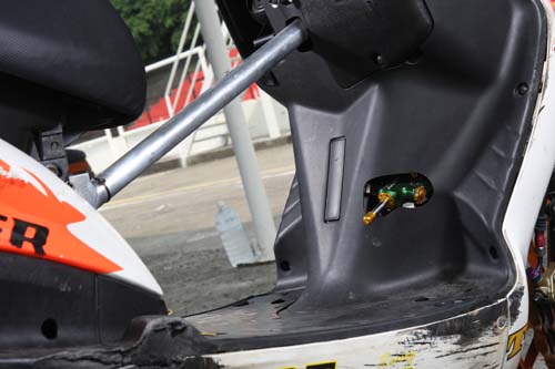 | 為提升車體剛性,特別在龍頭與行李廂中間以鋼管連結,龍頭也加裝RPM防甩頭提高轉向穩定度。 |