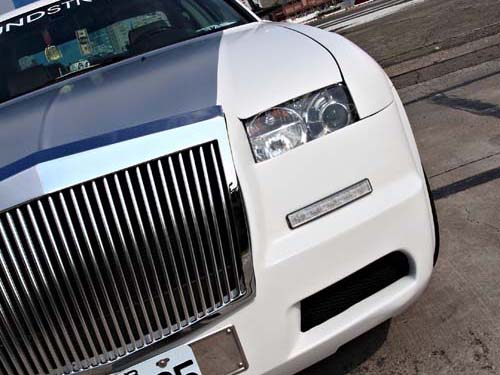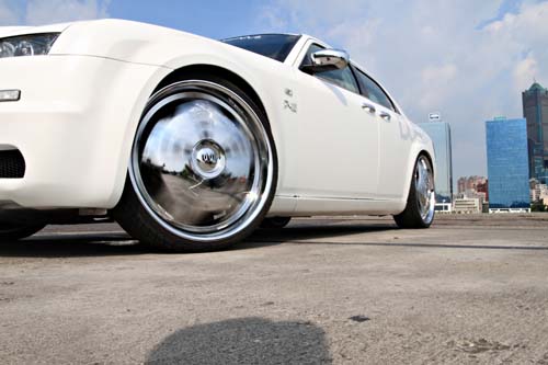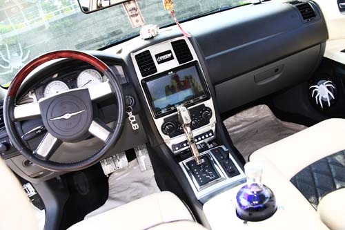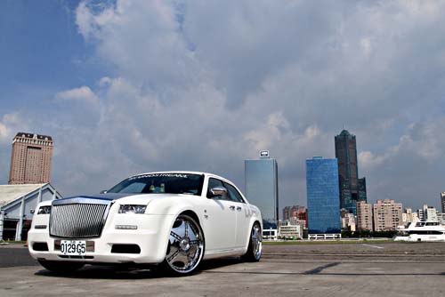 有的人改裝外觀套件,是為了強化車輛高速行駛的穩定性,有的則是希望彰顯愛車獨有的視覺衝擊,而有的則是藉由全面改造的車身鈑件,讓自己的愛車改頭換面,成為一部獨特且充滿個人風格的酷炫改裝車,就像這部Double R式樣的Chrysler 300C。初次乍見這部車,就深深的被其寬達24吋的電鍍鋁圈與神似Rolls-Royce的車頭造型所吸引,雖然筆者早在今年1月底的車迷活動中便已見過此車,不過直到現在近距離看到此車時,更覺得此車的特別,也對車主花費將近一年時間來改造此車的堅持感到佩服。從外觀來看,最注目的當然是完整度極高的車頭造形,寬大的鍍鉻水箱護罩,加上長方形的頭燈與向下延伸的前保桿,盡顯此車的氣派,雖非原創設計,但想把原本300C的車頭造形改造成這樣,當中所花費的精神與氣力可是相當不容易。而走到車側,尺寸高達275/25R24的輪胎,搭配DUB電鍍鋁圈,整個車側的視覺張力就靠這四個鋁圈就搞定,且這款鋁圈不只靜態時造型搶眼,車輛開始行駛時的動態表現更吸睛,「車動它不動、車動它才動」是對其最佳的描述,由於該款鋁圈中心設有滾動軸承,因此當車輪開始轉動時,電鍍外蓋是不會轉動的,從車側來看還以為輪胎怎沒在轉,而當車輪開始減速甚至到靜止時,因慣性的關係,電鍍外蓋反而開始轉動,搞得停紅燈時,車旁的一堆機車騎士都在行注目禮,心想這台車的鋁圈怎麼還轉個不停,筆者只能說:「真是太屌了!」。