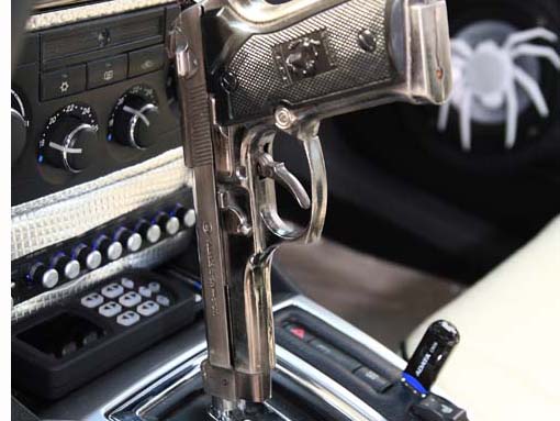 | 原廠排檔頭竟然是以一把玩具槍來代替,加上中央扶手內的伏特加酒瓶,車主戲稱:「晚上遇到警方臨檢時,雙手都要放在方向盤上緣,以免被警方掏槍警告!」,不論是話題或創意都拿到滿分。 |