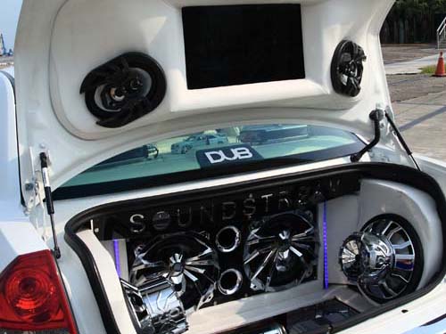 | 為了營造移動PUB包廂的稱號,行李廂內滿滿的音響設備是不可少的,且Tuner還巧妙的將氣壓避震器的充氣設備,融合於行李廂的配胎空間內。 |