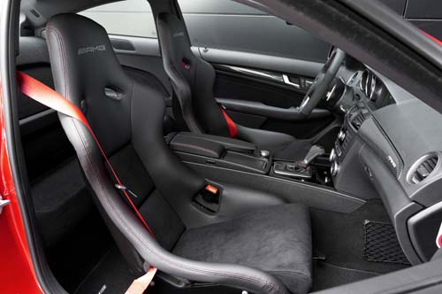前後軸距各加寬56及84mm後,順勢套入前225/35 R19、後285/30 R19胎配新款鍛造輕量化輪圈,配合一段可調高低特製傳統彈簧避震,重心低了,就有本事更快過彎。從種種設計中可見此車並不是依賴一堆電子設備而達成要求的操控,而是從根基入手,保留「真跑車」設計必要之精髓。剎車採前六、後四搭配複合材質通風碟,變速箱是七速的AMG Sportshift手自排,提供四種換檔模式選擇,在以快為要的Sport Plus模式下,換檔僅需0.1秒;後限滑差速分三段設定,引擎、變速和制動盡屬Track Day的必殺技。座椅安排基本設定是兩張不可調的桶型賽車椅,足見本車的Hard Core程度。一定要四人乘方便去趴的話,可另加配標準版AMG C63的後座桶椅。