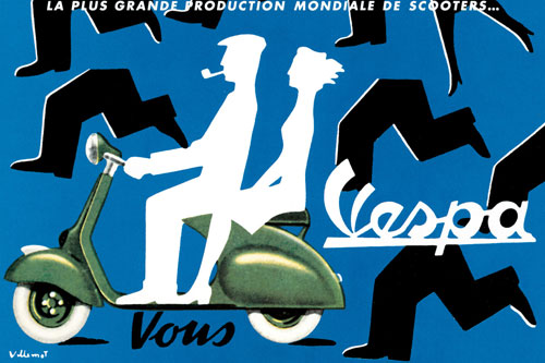 Piaggio公司成立於戰後,原先生產鐵路及飛機相關器材,有鑑於當時個人消費市場的蓬勃需求,故要將廠房做一番轉型。工程師 Corradino D’Ascanio 構思出一種兩輪交通工具的創新想法,不僅比傳統的跨騎的摩托車容易駕駛,而且其底盤、及車體的設計,還可以避免衣服不受車輪濺起的泥土弄髒衣服。他在1944年製造出機車的原型,經過兩年的測試,Piaggio 集團開始生產這個新型機車,並命名為 VESPA(意思為「黃蜂」)。當時英國時報文章描述其為「完全是義大利的」產品,彷彿是多年以來前所未見之盛聞。