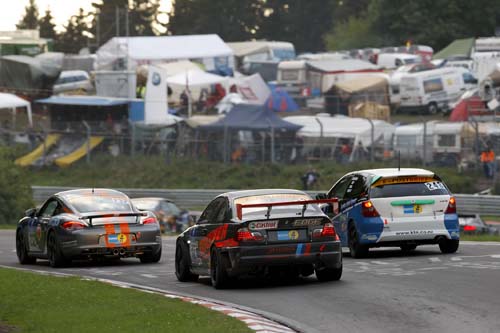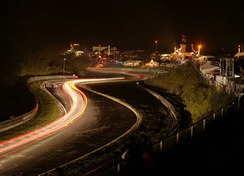 還有一點與眾不同的是,紐堡靈24小時大賽發生事故時並不會出動安全車來全場繞行,而是只會在事故路段縮減大約一半的路寬來進行處理,此時僅剩的路寬也只能讓賽車放慢依序通過。此外,近年來每次比賽的入場觀眾大約都到20萬人,而看這種24小時大賽,如果買南賽道的看台票就反而沒意思了:許多觀眾會在北賽道的路邊森林搭帳篷當做觀賽據點,車手晚上可以瞥見露營地烤肉的火光,甚至路面窄到可以聞出來他們在烤什麼!總之,一年一度6月底的盛事,把它當成一次嘉年華式的週末休閒度假更自在(與6月初的勒芒一樣在下午4點開賽、次日同時結束)。由於車速愈來愈快,因此完賽圈數也愈來愈多,今年冠軍Porsche 997便寫下了156圈的新紀錄,但算下來平均車速也「不過」162km/h左右,就因為場地的危險起伏彎道太多、到了晚上死角更多(只在南賽道附近有較多照明設備,危機四伏的北賽道幾乎都只能靠賽車自己的頭燈而已──而且北賽道在白天已經有許多死角、盲彎),車子再強也無用武之地──紐堡靈賽道大多都是這樣的場合,因此賽車馬力反而不是最大關鍵,重點在於如何將底盤懸吊調校到在連續彎道還能緊貼崎嶇路面。