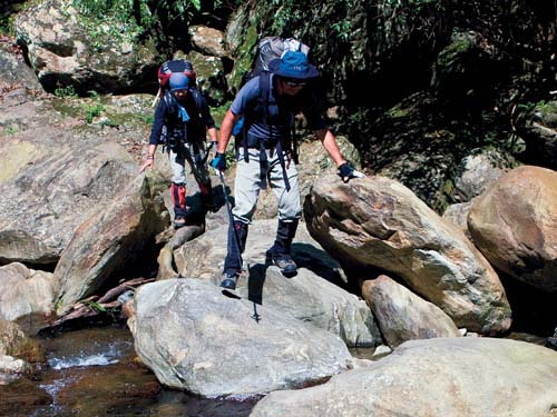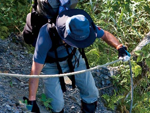隔日清早,發現如此清澈自然的溪流裡,水族生物卻不多,這一帶的苦花不但數量極少,而且體型也很小,已無垂釣的價值,比起上一次前來有如天壤之別。拔營往上游前進。渡溪之後立刻就開始陡上,地面更溼,坡度更陡,幾乎沒有平整或平緩的位置,算是完全進入了蠻荒的世界。獵徑的路跡還算明顯,但是幾乎都淹沒在草叢藤蔓之間,許多路段皆沿著山崖的邊緣前行,大部分路段必須手腳並用才能順利前進,腳步幾乎都是踏在傾斜的坡面上,一路走來腳踝相當不舒服,而且步徑非常狹窄,大部分路段幾乎都只有一隻鞋的寬度,尤其是經過有落差的路段,下一步要踏在哪一個點必須小心判斷,稍有不慎即會滑倒。直到再度下切溪谷為止,這段路途幾乎都是這樣的路況,還得經過數個崩壁地形,雖然實際距離並不遠,但是值得拍攝的畫面俯拾皆是,也使得我們行進的速度相當緩慢。雖然路不好走,但是幾個崩坍地形處卻有簡易的繩索架設,應該是經常在附近山區打獵的原住民所設置,即使如此,要負重通過這些坍塌崩壁還是有些危險,不得不佩服原住民獵人的「實力」。