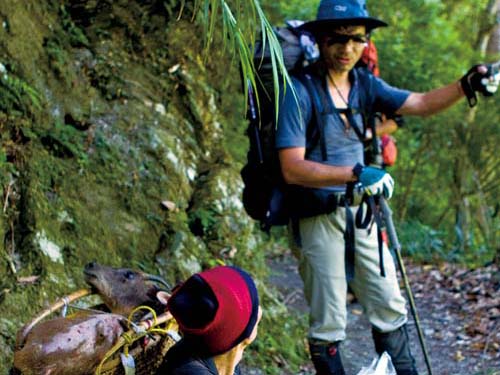 | 原住民獵人正要背著獵物回到部落裡。 |