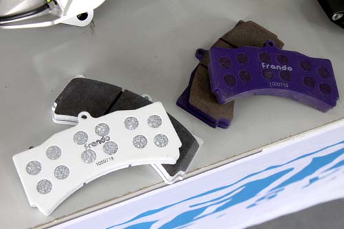 | Frando在制動力最關鍵的來令片上使用高性能材質與特殊配方,目前推出競技來令片(白色)其摩擦係數 0.5~0.62μ,至於街道版來令片(紫色)其摩擦係數為0.44~0.55μ。 |