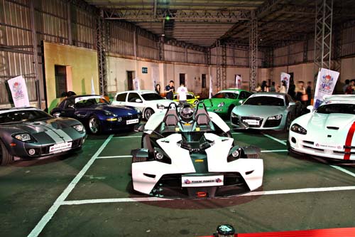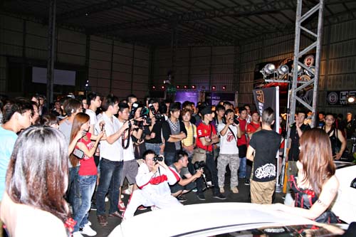 此外,為了讓整個佔地約600坪會場的氣氛有如夜店般令人著迷,E51-Car Studio在籌備活動時,便請參展廠商特別注意擺設攤位的設計與燈光效果的掌握,以求這些攤位也能成為最佳的會場「包廂」,不只吸引車迷的目光,也能讓坐在包廂內的廠商來賓,有如置身於真的夜店中,好好享受這奇特氣氛。至於最重要的主舞台部分,則不惜斥資花費數十萬元,架設舞台、燈光與音響設備,讓眾多車迷一入場就有值回票價的感受。而有了香車、舞台與燈光,沒有美人豈不掃興,因此當天不只可見到各家精品廠商找來的眾多Show Girls,不斷擺出各種撩人姿勢供車迷拍照外,主辦單位也同時邀請了多位火辣舞者,伴隨著現場的搖滾音樂盡情舞動身體,將場內氣氛炒熱到最高點。