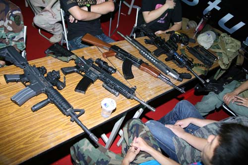 | 一堆M16、AK47步槍就直接放在桌上,我沒看錯吧?這是主辦單位安排的活動之一,透過一些愛好生存遊戲的玩家來扮演衝鋒陷陣的部隊,串場演出讓當天派對活動更加精采。 |