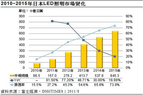 日本在2012年開始要求各照明廠商停止製造、銷售白熾燈泡,屆時電球型LED燈的需求量將可望增加,故2011、2012年會是LED照明的高度成長期,年成長率將在70%以上。因LED照明需求在2011年提前爆發,2012年後市場成長將趨緩,但因日本政府有意在2015年提供次世代照明補助計畫,以達成2020年高效率照明市場規模達100%的目標,故LED照明市場仍將以一定的速率成長,DIGITIMES Research預估,2015年LED照明的市場滲透率將達近75%。