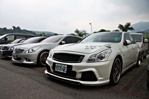雖然性質上偏向於溫馨的家庭路線,但是實際在眾多車友愛車之中還是能夠找出不少改裝精銳,在眾多G35車款最受矚目的改裝範點就屬這輛白色Show Car,由JGTC協助安裝國外空力套件後讓G35變的格外具有侵略氣息,大型進氣壩、前後下擾流與側裙裝扮下相當有看頭,此外BBS鍛造輪圈與多活塞卡鉗也正好呼應外觀應有的運動風格,雖然未能拍到內裝但是從車窗外就能清楚看到兩張功夫籠桶椅,極高完整性的改裝手法可見得這位車主具有相當高的眼光與水準。此外現場還有兩部改裝風格相當迥異的G37S,採用全車消光橘配色的G37S額外搭配消光黑色調,搶眼之中充分呈現出蓄勢待發的攻擊姿態,從水箱護罩、車頂到輪圈配色均延用此設計手法,為了配合淺色系所需就連頭燈都換上特別色膜以營造整體氣勢。而屬於VIP式的改裝手法也在G37S中同樣出現,可以看見這輛幾乎算是趴在地上的G37S,前後輪都藏於輪拱之中雖然看似完全無法在路上行駛,但是在氣壓式懸吊輔助後能夠隨時調整車高,這樣一來在也不用擔心愛車因違規停車而遭受拖吊車無情的摧殘了。