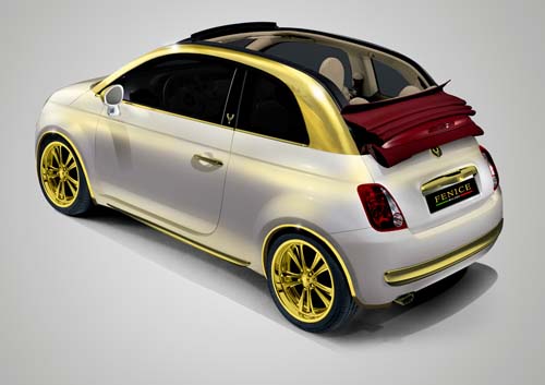 這部號稱價值66.6萬美金的500C Abarth,是以黃金與鑽石進行打造的,這是一位富有的華裔商人委託義大利一家改裝公司「Fenice Milano」所特別打造出的黃金/鑽石版500C Abarth。而這部黃金鑽石車的引擎蓋飾條、水箱罩飾條、頭燈框/霧燈框、防撞飾條、後視鏡蓋、輪拱飾條、排氣尾飾管以及從A柱延伸至C柱的車頂弧線處,皆以24K的黃金所打造,甚至是四只輪圈也都鍍上了24K純金,再配合特殊的珍珠白車身烤漆,讓整車除了散發出金光閃閃的瑞氣外,更擁有無比的雍容貴氣。車室內同樣是充滿黃金貴氣,包括方向盤、儀錶板、門把以及各按鍵框飾等,也都全數採用24K黃金材質打造;而最吸睛的就是中控檯上「iPad蘋果電腦螢幕」,除了採可拆式設計外,其背殼上方與蘋果形狀的Logo,乃以上百顆的真鑽鑲嵌,成為史上最昂貴的平板電腦,也讓整個車艙充滿了珠光寶氣。