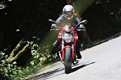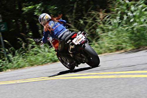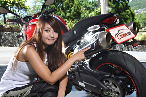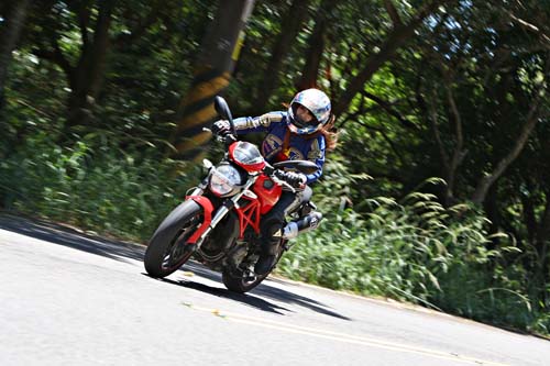在這拍照的時間內筆者也與雅雅有些許的小互動(商量拍照姿勢),也發現雅雅的個性就像當天的高氣壓相當晴朗。也因此問了雅雅在這都是男性居多的世界裡,像她這麼亮眼的女性想必一定是追求者不斷吧!不過雅雅說追求者雖然有,不過她就是單純的喜歡騎車而已,因此大家也都知道,不會特別做出任何越軌的行為,而目前還單身的雅雅也說了,如果要交男友首先當然必須像他一樣熱愛重機(嗯!這點筆者有),再來就是善良、有上進心還有要對她好,這樣就足夠了(怎麼好像在電視裡看過這台詞?)。最後這輛`09年的DUCATI推出的Monster系列新版的696,可說是雅雅的精選之作。外型比起前一代更加運動外了,排氣管由原本的側面改為新式的後排,也讓整部車的重量也減輕了5公斤,對於女性來說操控上也更加輕鬆,新式的四行程V2引擎,活塞與燃燒室採用與Hypermotard-1100相同設計,使得動力增提昇至80hp/7kgm,並加入了APTC新式離合器,不僅使得換檔更加精準,同時也減輕了離合器的操作力道,使得像我這樣的女性騎士也能輕鬆駕馭。『文字太多可由第一、二頁開始走 謝謝!!』