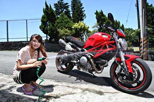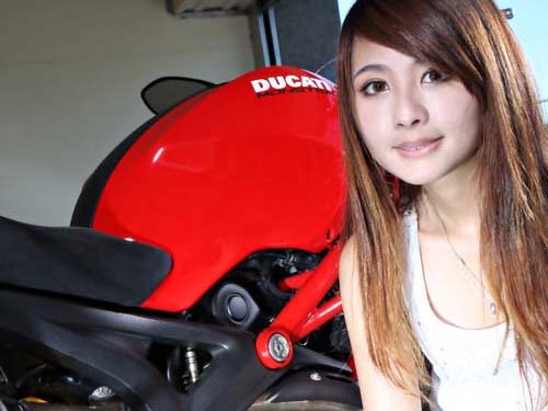 早上十點半不到就聽到老遠V2引擎特殊的排氣敲擊聲浪,這就是我們今天的主角重機美女雅雅。嬌小的身材支撐著這輛擁有163公斤的DUCATI Monster 696卻是一點也不吃力。而亮麗的長髮在脫下安全帽瞬間更讓男人猶如觸電般心不禁的顫動了一下,安全帽下那張嬌小清秀的臉龐及大大的眼睛,更是無法讓人與重機結合。沒有名牌包包、沒有濃郁的香水味,在筆者眼前的就只有一個願意頂著35度高溫全身穿滿裝備的小女孩,濕透的瀏海讓筆者感受到雅雅對於重車的堅持。雅雅表示:「在還沒記憶的小時後,媽媽就說我都會讓芭比娃娃坐在車上,讓她們換各式各樣的車,而不是像一般小女生玩的扮家家酒,一直到18歲時就買了人生第一輛機車(速克達)來代步。