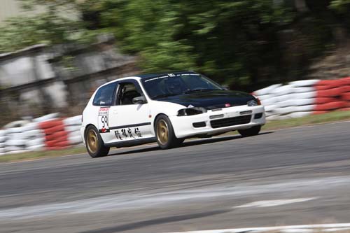 | SHADOW-ISC亞軍 1:01.365邱志華車號:59/車隊:SHADOW-ISC/車型:K6 3D/我的秘密武器就是引擎室裡B20B下座+B16A上座的金剛合體心臟,大排氣量的加速力道,絕對不是小排氣量可以比擬的,再加上205/50R17的595 RS-R幫助之下,跑起來相當順暢;可惜組內的車輛數有點多,讓大家都跑得有點綁手綁腳。 |