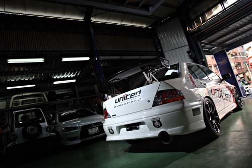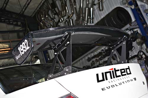 外觀部分同樣也是本車的另一重點,車頭除了前保桿為FRP材質外,左右葉子板與引擎蓋都是聯結自行開發的United碳纖維套件,此款碳纖維套件不但密合度相當優異、重量輕外,強度相當的不錯,不像坊間軟趴趴的碳纖維套件在行駛時容易造成晃動的現象,本車在高速行駛時這組套件就像原廠鈑件一樣穩固、牢靠,由於材質與製程相當注重,因此售價也比一般套件高出一些。其實該車在改裝方面尚未盡完善,尤其是動力與防滾架的部分,對於未來大鵬灣賽事來說或許稍嫌不足,最主要是因為目前賽事的規劃並未完整,規則也沒有任何的確認,所以本車目前的狀況只是建構在最基本的架構上,只要確認賽事規格後便立即能夠換上相對應的軟硬體配備,以便打造出最緊繃的EVO賽車。