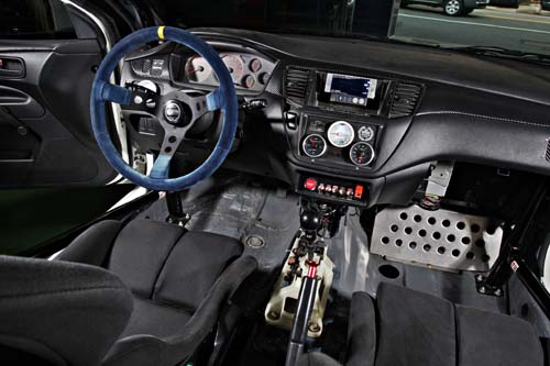 而內裝方面採用標準廠車化設定,不必要的內裝全部拆空僅留下門板及中控台,儀錶板部分則維持原廠樣式,在方向盤左側及中控台安裝所需的監控儀錶,此外最特別的地方就是排檔座,採用Ikeya Formula序列式排檔座,排檔方式變成類似手自排方式,但因還是原來的變速箱,因此還是免不了左腳要踩離合器方能入檔,但能夠有效減少換檔時間。此外,後行李箱部分追加了廠車必備的防爆油箱與副油桶,這些都是標準賽車化的必要配備。
