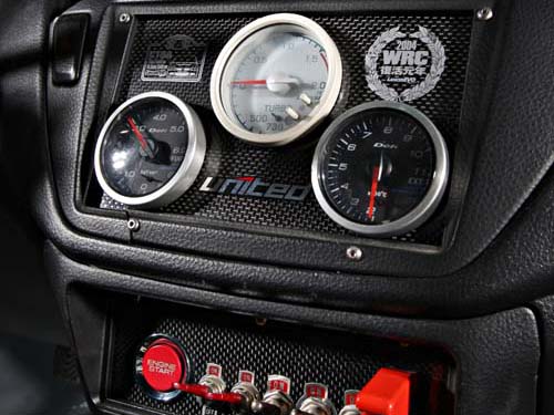 | 中控台上方配置了簡單的Apexi AVC-R與Defi儀錶,而下方則是賽車專用的開關系統。 |