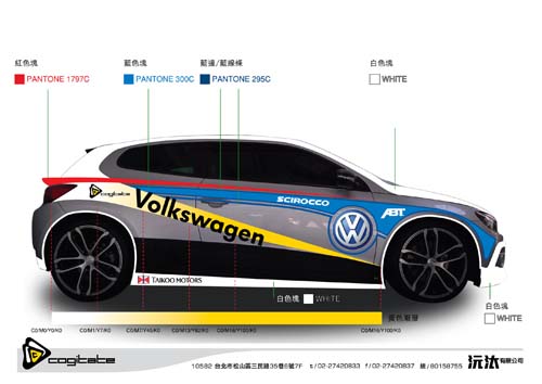 根據Cogitate沅汰台灣區的負責人Hawk表示,所有可被執行的設計都需要仰賴對產品屬性有充分了解後產生設計的創意,結合製作與材質運用上豐富的經驗,才能精準的計算出成本與效益的平衡,如同這次操刀大鵬灣VW Think Blue Scirocco ABT的車身彩繪設計,以季風為名的VW車系(Golf、Scirocco…),在優越性能的鋼砲心臟下,如同季風般奔馳吞噬每一個彎道,貼近再貼近每一吋道路,德國狼堡的血液+ABT改裝元素,在Cogitate的設計裡我們清楚看到了融合與力道的完美組合,原來在設計領域上竟是藏有如此深不可測美學功力,看來對於產品設計一翹不通的筆者可得要好好加緊學習。