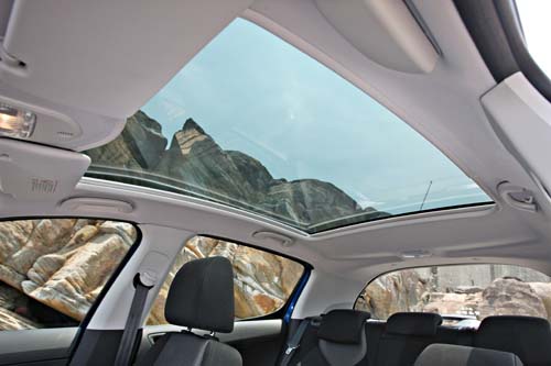 | 308最大的特色之一就是搭載了無阻礙的全景式玻璃車頂,僅需壓下中央扶手上的按鈕即可享受無保留的陽光毫,令人享受到極佳的視野及採光,不過唯一的缺點應該就是台灣的天氣實在太熱,太陽直射的高溫真的讓人有點吃不消。 |