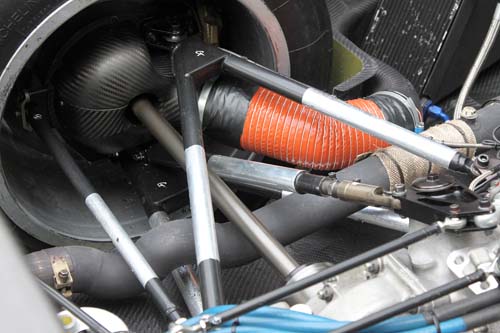| 位在進氣口兩側的圓孔蓋是Formula Le Mans加油孔,當需要加油時必須同時將兩個油桶插入兩邊才能快速加油以避免燃油噴出。 |