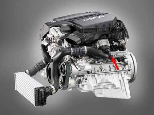 | MQN41 Performance是由一組轉接線組與電腦本體所組成,由於對應的車種皆為搭載渦輪引擎的車款,因此在引擎週邊管路上都可找到紅色箭頭所指的原廠「渦輪壓力感知器」,而該款電腦便是要與此感知器進行連接。 |