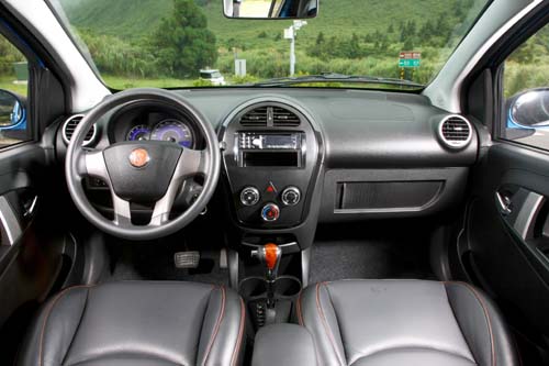 打開車門、進入車室後可發現一股相當熟悉、與同廠M’car相當近似的座艙配置,除了四幅式樣方向盤與中控面板的操作介面略有不同外,其餘無論是中控檯兩端的圓形空調出風口、滑門設計手套箱、儀錶組等處的配置,都與M’car有著異曲同工之妙。但相對的,雖然W’car的座艙仍不免大量運用較具成本考量的硬質塑料鋪陳,但tobe設計團隊又再次於車室乘員最常看到與實際接觸的相關細節,充分發揮國人最擅長的巧思改造精神。並在空調出風口的圓形外環、方向盤與車門內把手等處,以銀色髮絲紋飾板來點綴,加上黑色鋼琴烤漆飾板處理的扇貝形中控檯外框,以及1.5L 2A自排試駕車所額外選配的人因工學黑色皮質+橘紅色縫線座椅,與可折疊式樣的前座中央扶手等配備,有效提昇一般同級距小車較難達成的座艙高級感。