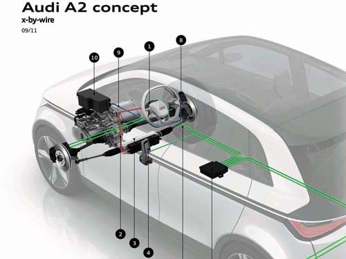 | A2 Concept在使用全電動技術之外還加入了大量的線傳控制技術,從方向盤、煞車到檔位選擇均透過 電腦控制。 |