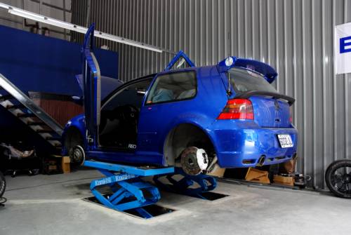 除此之外,該店還藏著一輛全台改最兇的四代R32,二話不說!相機一背立刻殺到店門口,只見寶藍色的Mark 4靜靜地躺在頂高機上、脫下兩雙18吋大靴休息當中,披上一層薄沙的鈑金,不但絲毫未令人感覺蒙塵,輕吹即散的飄逸感,反似若隱若現的女性胴體般令人興奮。