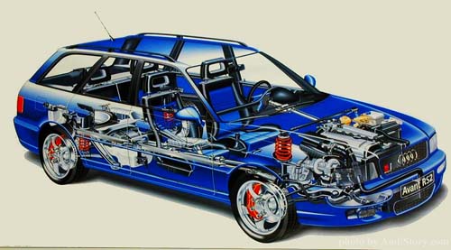 源自Audi Quattro的2.2升直五渦輪增壓引擎,經過Porsche工程人員的再次調校,KKK製作的渦輪增壓器換上大一號製品,凸輪軸、噴油嘴的規格也經過修改,並採用Bosch最新的引擎監理電腦系統,繼而榨出高達315匹的最大馬力,再搭配密齒比的六速手排與Quattro四驅系統後,僅需4.8秒就完成0~100km/h加速,極速限制在250km/h。限量的RS2 Avant在1994~1995年間製作出2891部新車,其中包含180部的右駕版。