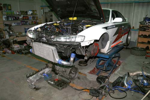 位於高雄鳳山的千禧汽車,向來以改裝大馬力日系怪獸出名的千禧汽車,其掌門人陳慶賀在上一站4/24的OP盃零四試辦賽中便曾派出一輛黑白Supra參賽,並親自駕駛一部黑色的EVO VIII參賽,並做出了反應時間0.249秒、總時間13.073秒的優異成績;這次除了EVO VIII依舊參賽之外,又新增了這輛白色的Silvia S14,而車主便是車界鼎鼎大名的「夜王」陳柏蒼,這次捨棄了來的SR20DET,改搭載排氣量更大的RB26,並選用大尺寸的T04Z渦輪,在1.5bar高增壓的設定之下,預估可做出750匹的最大馬力,相信在這次12/18 OP盃零四加速大賽的成績肯定會更上層樓。