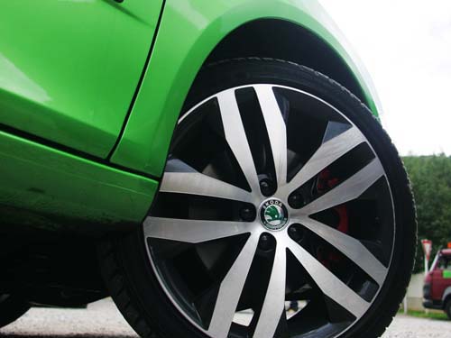 | Fabia RS下盤亦很講究。腳下搭載的是四只專屬的205/40R17、Gigaro款式的黑、銀塗裝鋁圈,並配搭了紅色煞車卡箝,視覺、效能兼具。 |