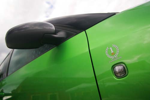 | Fabia RS前葉子板的IRC 2010年度冠軍徽飾,強化其賽事血統的淵源。 |