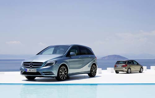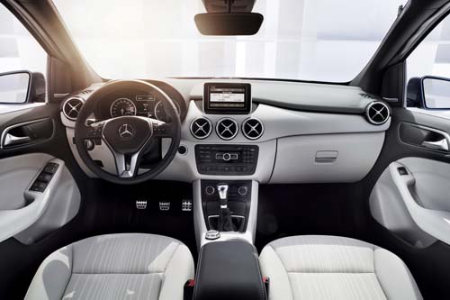 在內裝部分,大改款B-Class乃以細緻豪華的車艙設計取代了現行車款較為簡單樸實的調性,尤其用料質感與配備的豐富程度大幅提昇,可說已達了C-Class車系的水準。而在車室內最吸睛之處,除了中控檯上方的5.8吋TFT液晶顯示螢幕外,就屬於5個內部採「X」型格欄設計的圓形出風口,充分展現出與SLS AMG相仿的復古風情。而在安全配備上,全新B-Class同樣不馬虎,包括盲點及車道偏離警示系統、燈光自動控制系統、碰撞預警系統、速限警示系統以及Pre-Safe安全防護系統等皆列為標準配備。